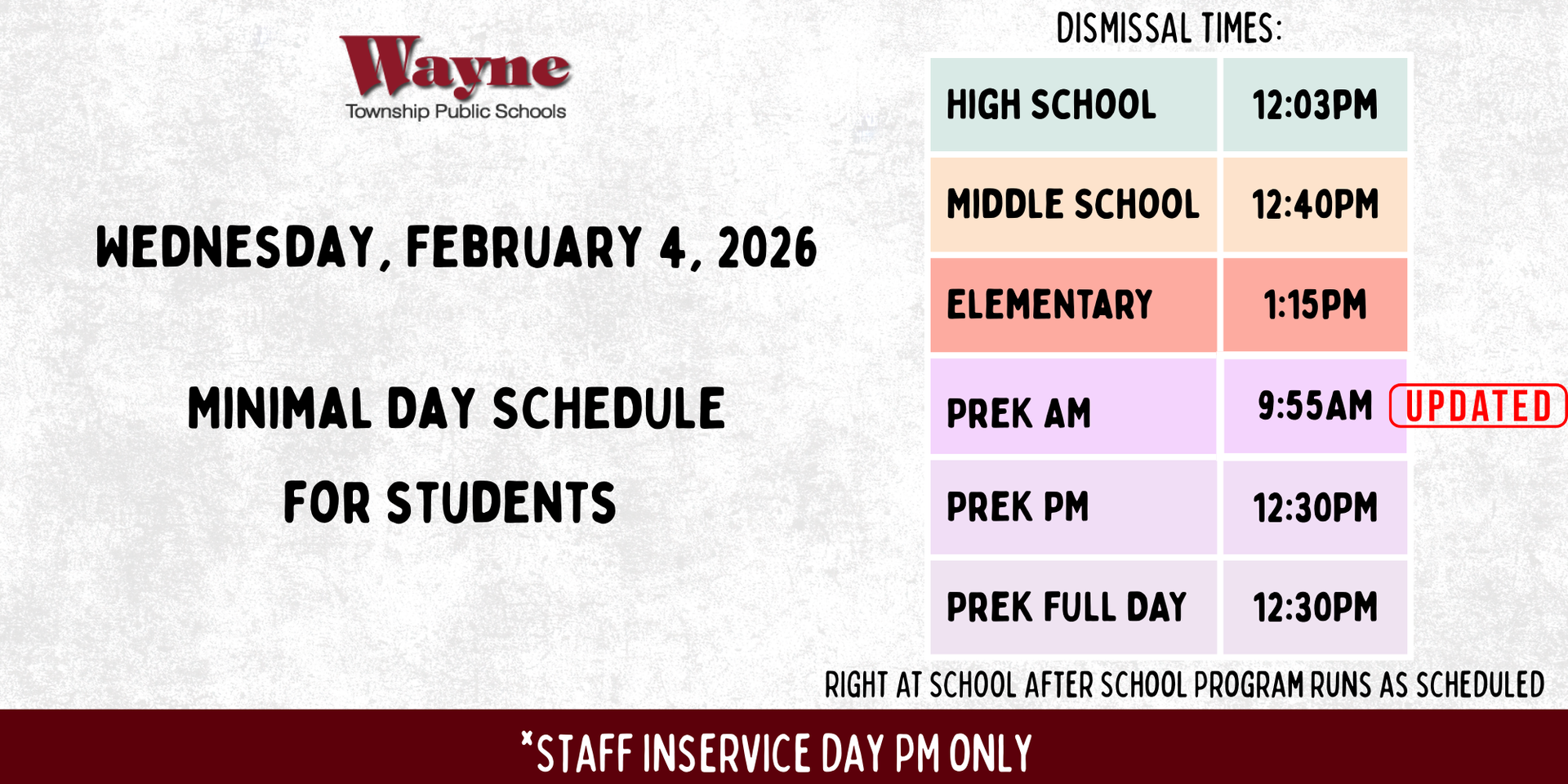 Wednesday, February 4: Minimal Day for Students-Staff Inservice Day PM |