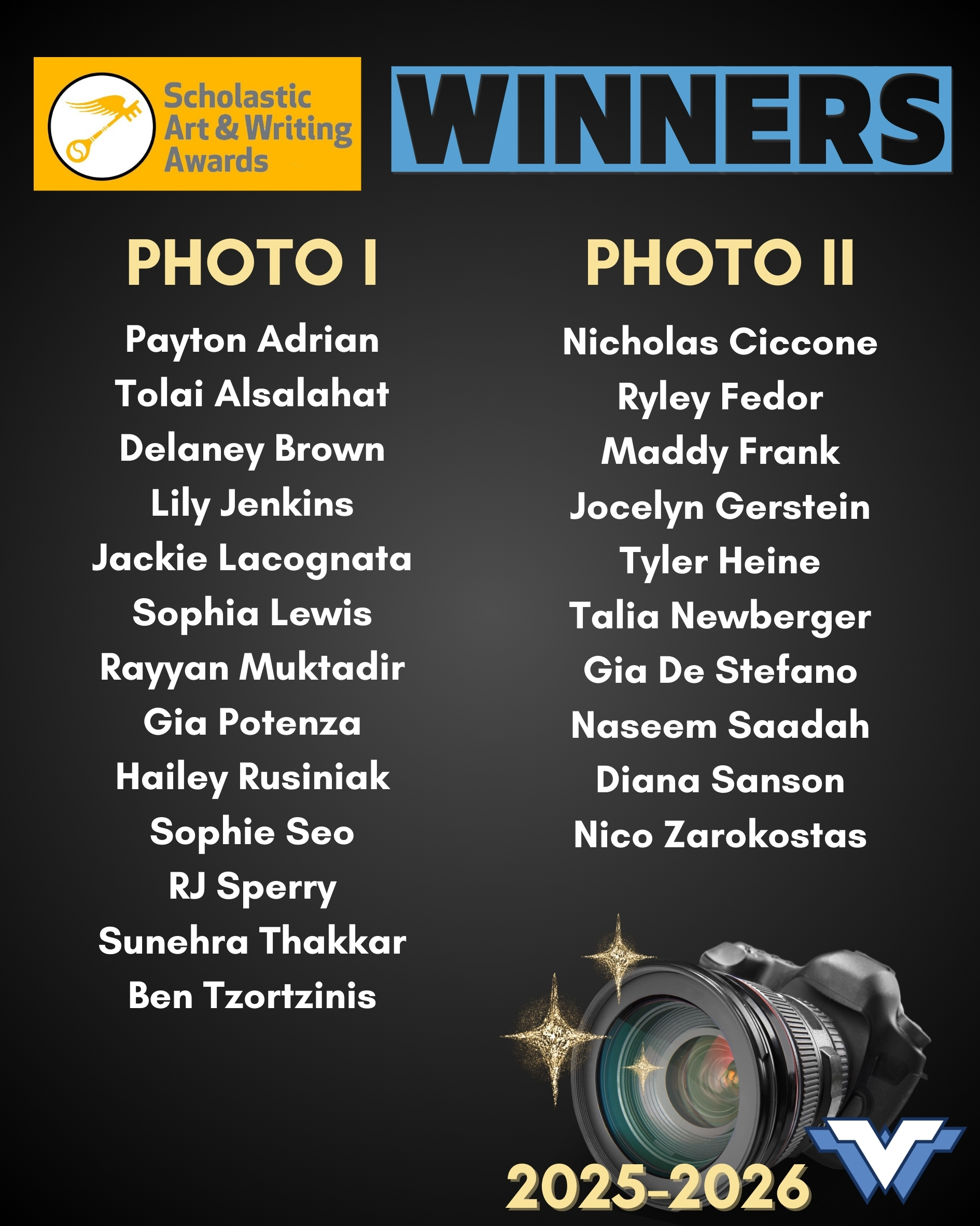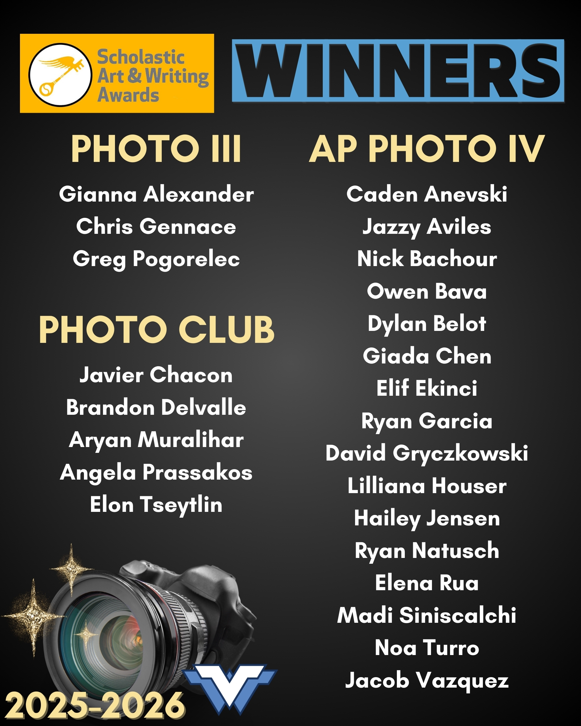 Each year Ms. Pritchard and Ms. Dean encourage their photography students to enter work in the long-running, prestigious Scholastic Art Awards. This year Valley Photo broke their own personal record by taking home 130 Regional Awards. All Gold Key winners automatically advanced to States for further recognition. State winners will be announced March 25, 2026. Good luck to Dylan Belot who is in the running for a $12,500 scholarship for his Gold Key Portfolio win! |
