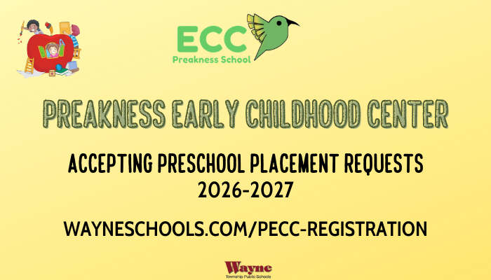 The Wayne School District is excited to announce that the Preakness Early Childhood Center will begin accepting preschool placement requests starting Tuesday, March 17. This opportunity is open exclusively to parents and guardians interested in enrolling their children for the upcoming 2026-2027 school year. wayneschools.com/pecc-registration