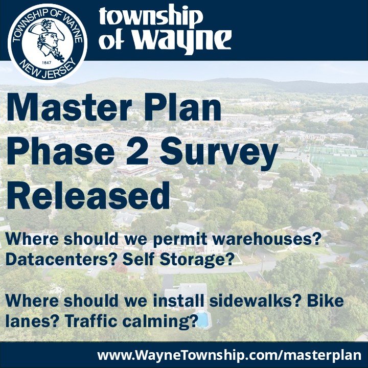 βWayne Township is preparing a new master plan to direct growth and development of the Township over the next couple of decades. As part of this, they are hosting an online survey to get feedback from the public regarding changes to permitted land uses and potential bicycle, pedestrian, and traffic safety improvements. The survey can be found at https://www.surveymonkey.com/r/KN33VC7. Additional information can be found at https://waynetownship.com/masterplan