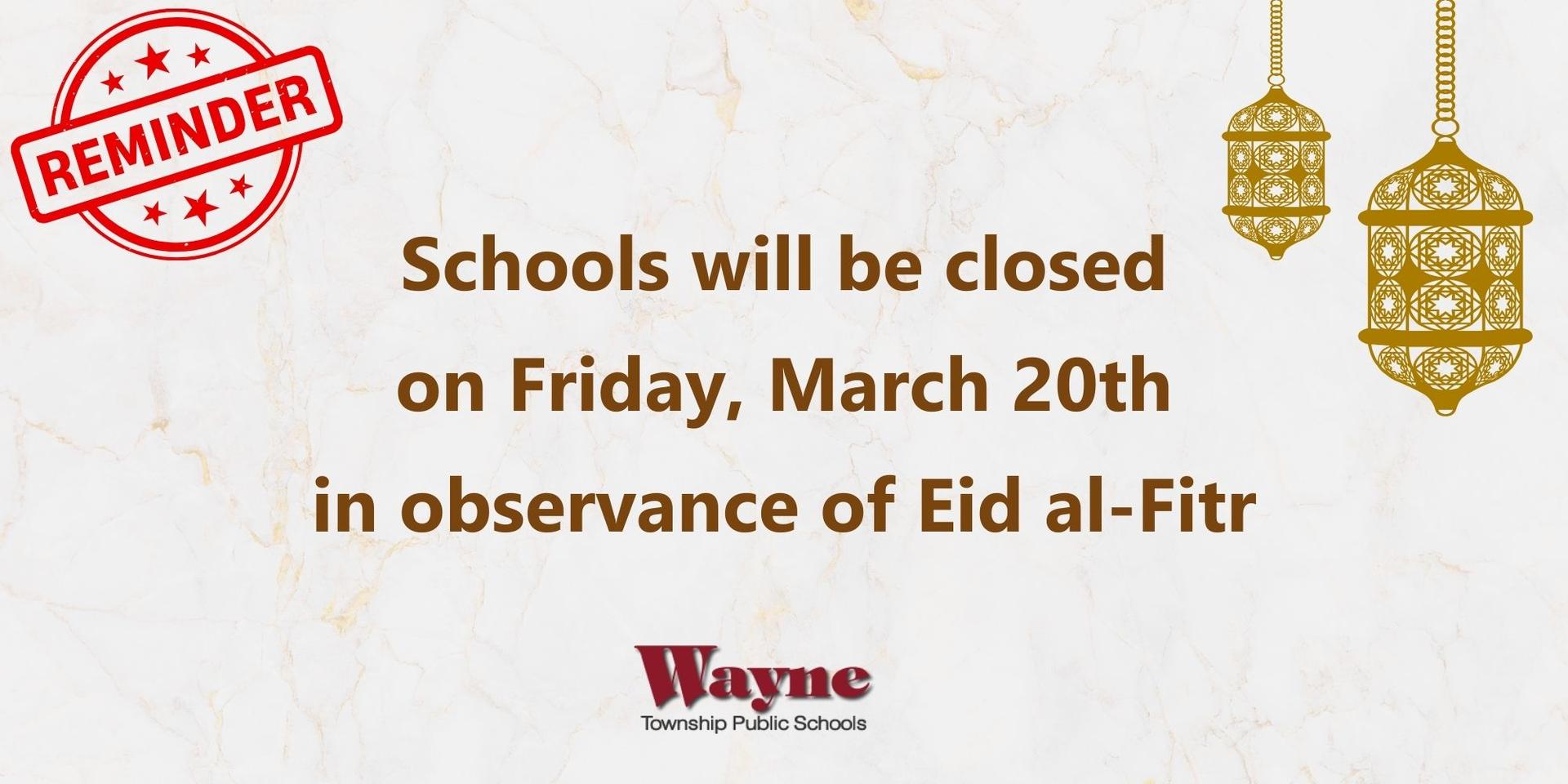 Friday, March 20: Schools Closed - Observation of Eid-al-Fitr Friday, March 27: Minimal Day - Start of Spring Recess Monday, March 30 - Thursday, April 2: Schools Closed - Spring Recess