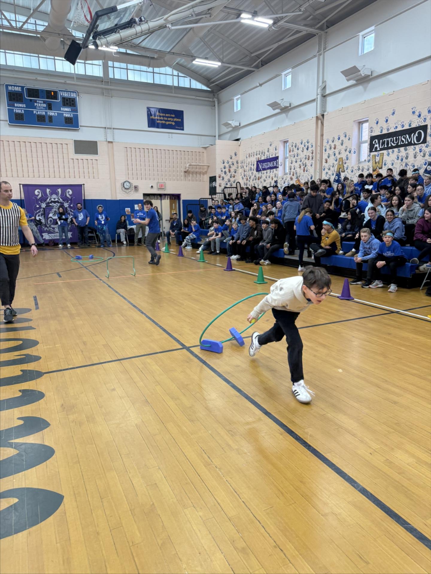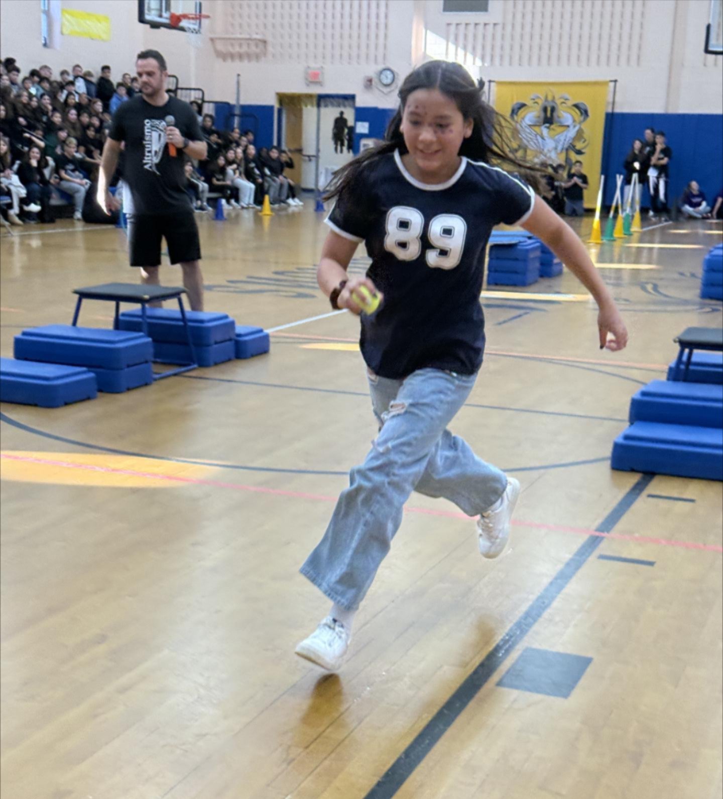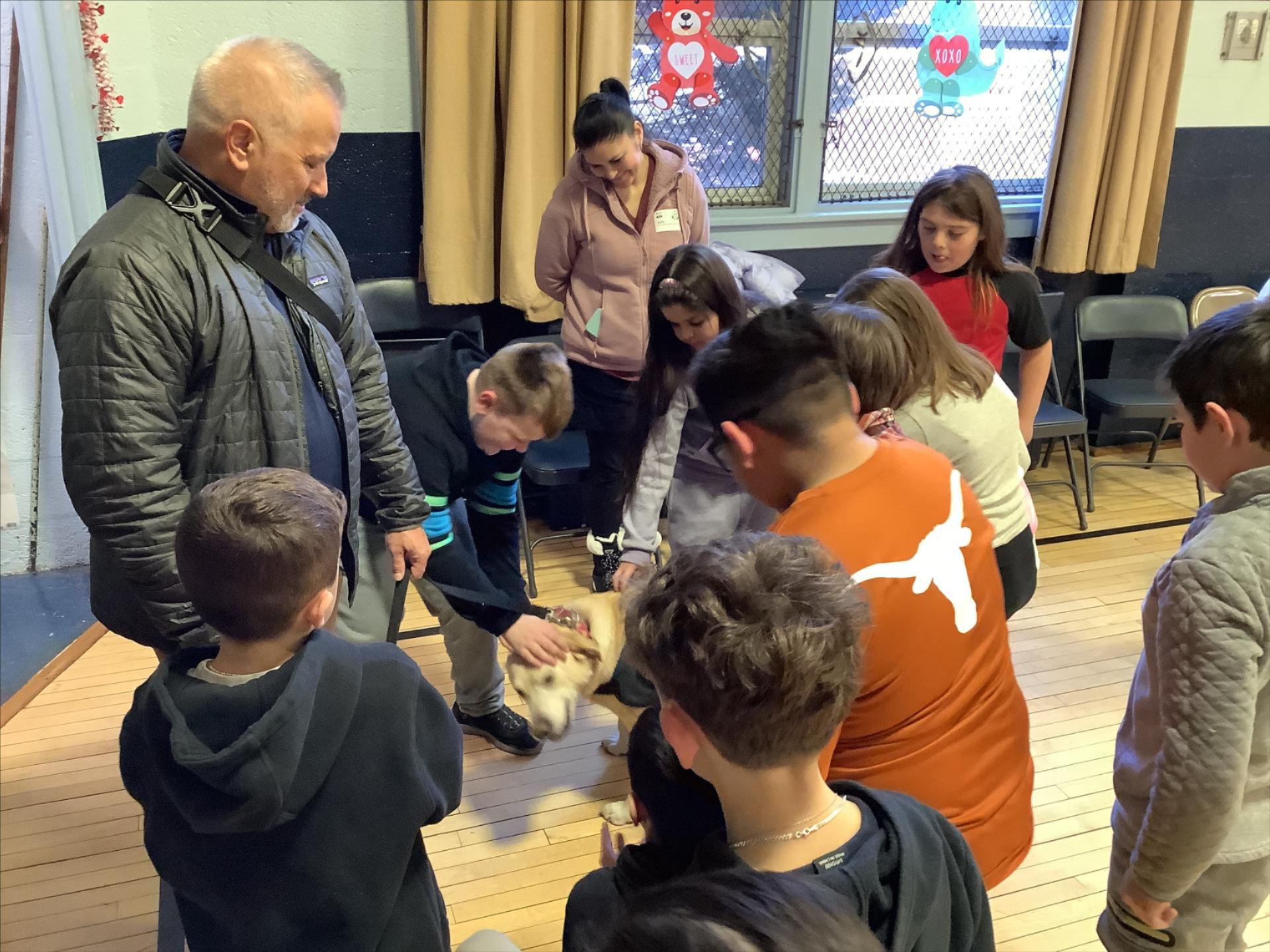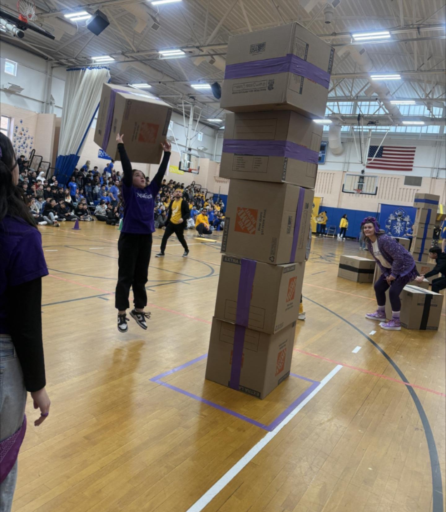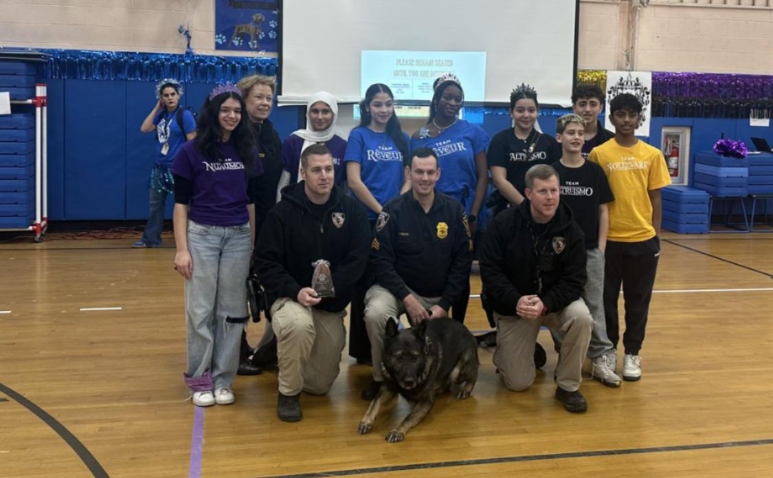 Continuing with the dog day theme, we kicked off the Change for Change project to collect money for the Wayne Animal Shelter and the Onyx and Breezy Foundation. Both assist the Passaic County Sheriff’s Office with various needs. Our one family, divided into four Houses, challenged each other in pep rally games for House points. These games included the “Dogstacle” Course (obstacle course), the Top Dog Tower (box stacking challenge) with boxes donated by the Riverdale Home Depot, the Walk the Dog Hula Hoop Contest, and the Air Bud Basketball Showdown.