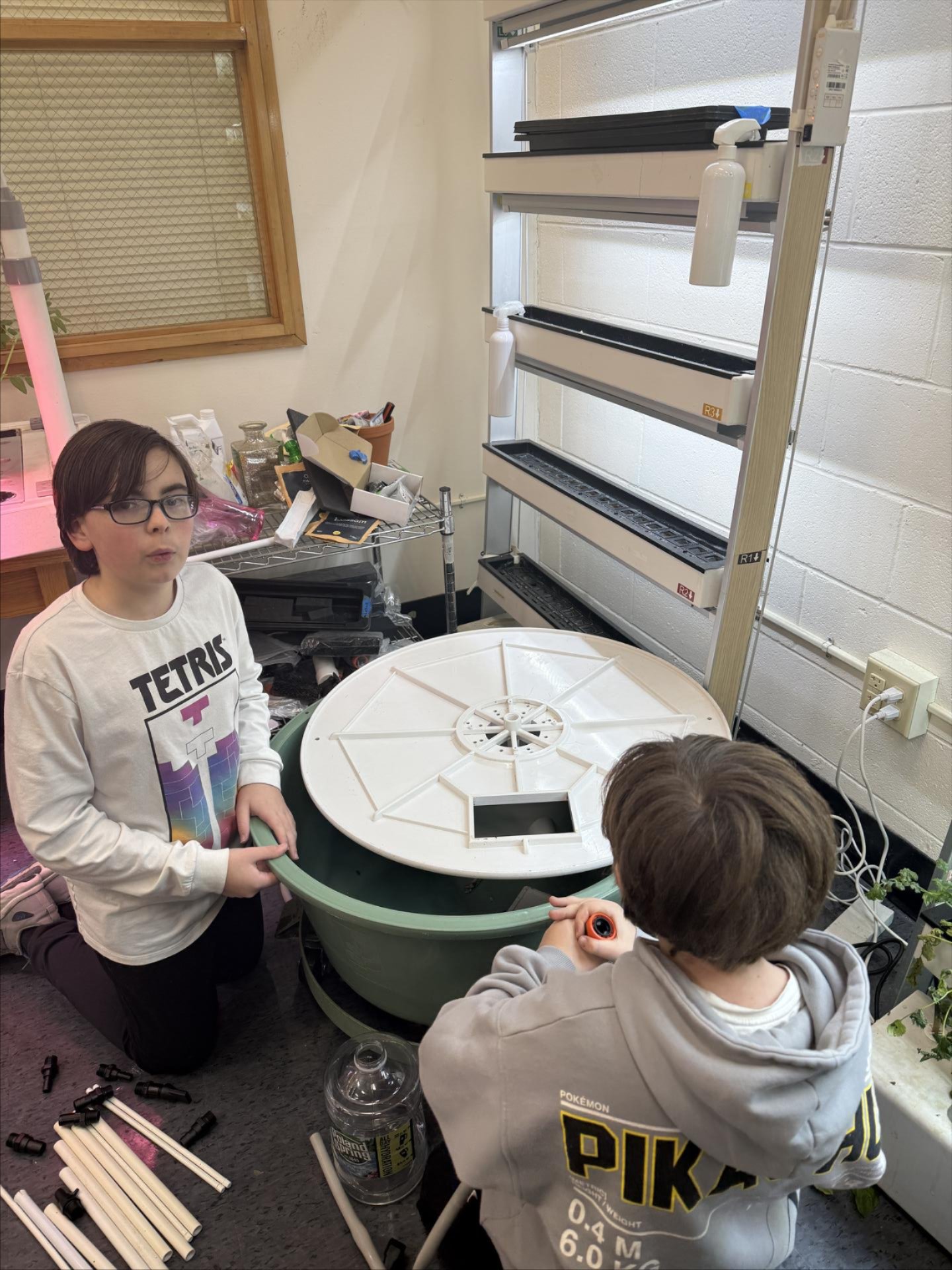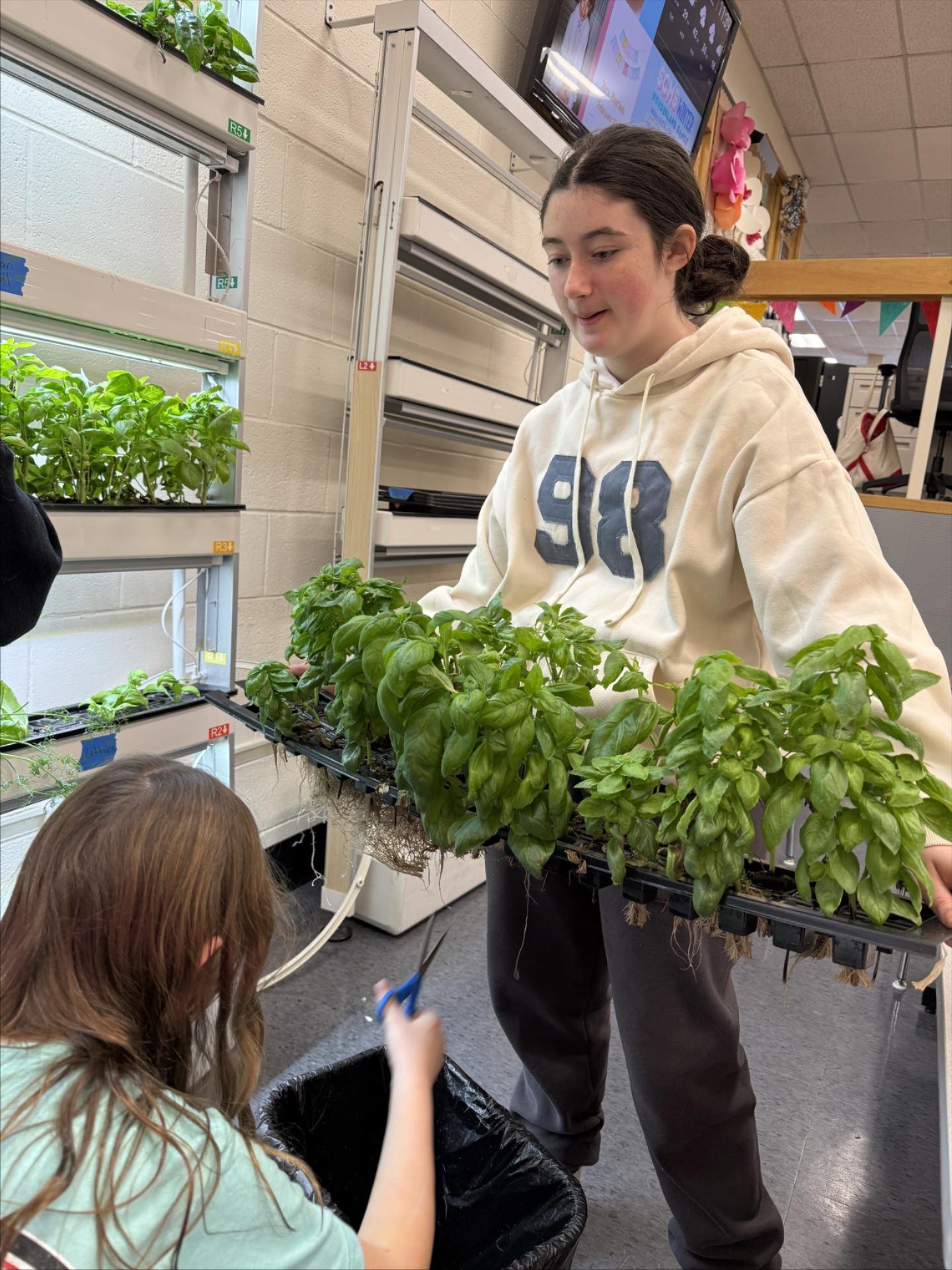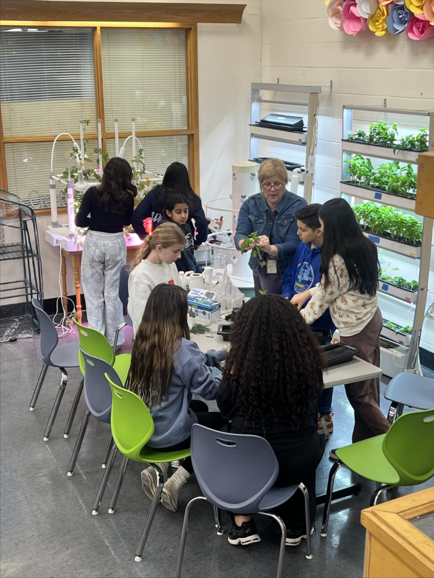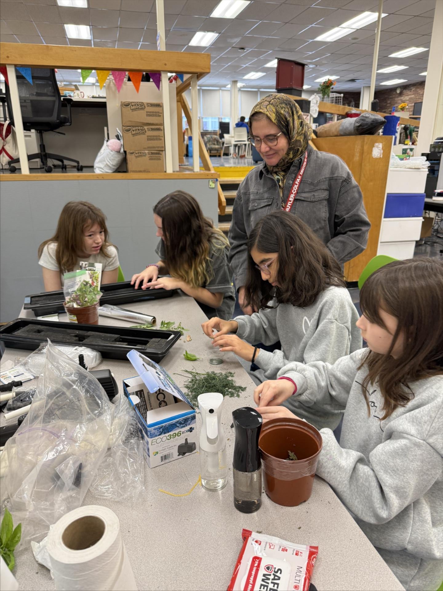 Sixth grade Schuyler Colfax students worked to propagate herbs, planted new seeds, and also worked to set up the new hydroponic garden tower donated by an SCMS family. |