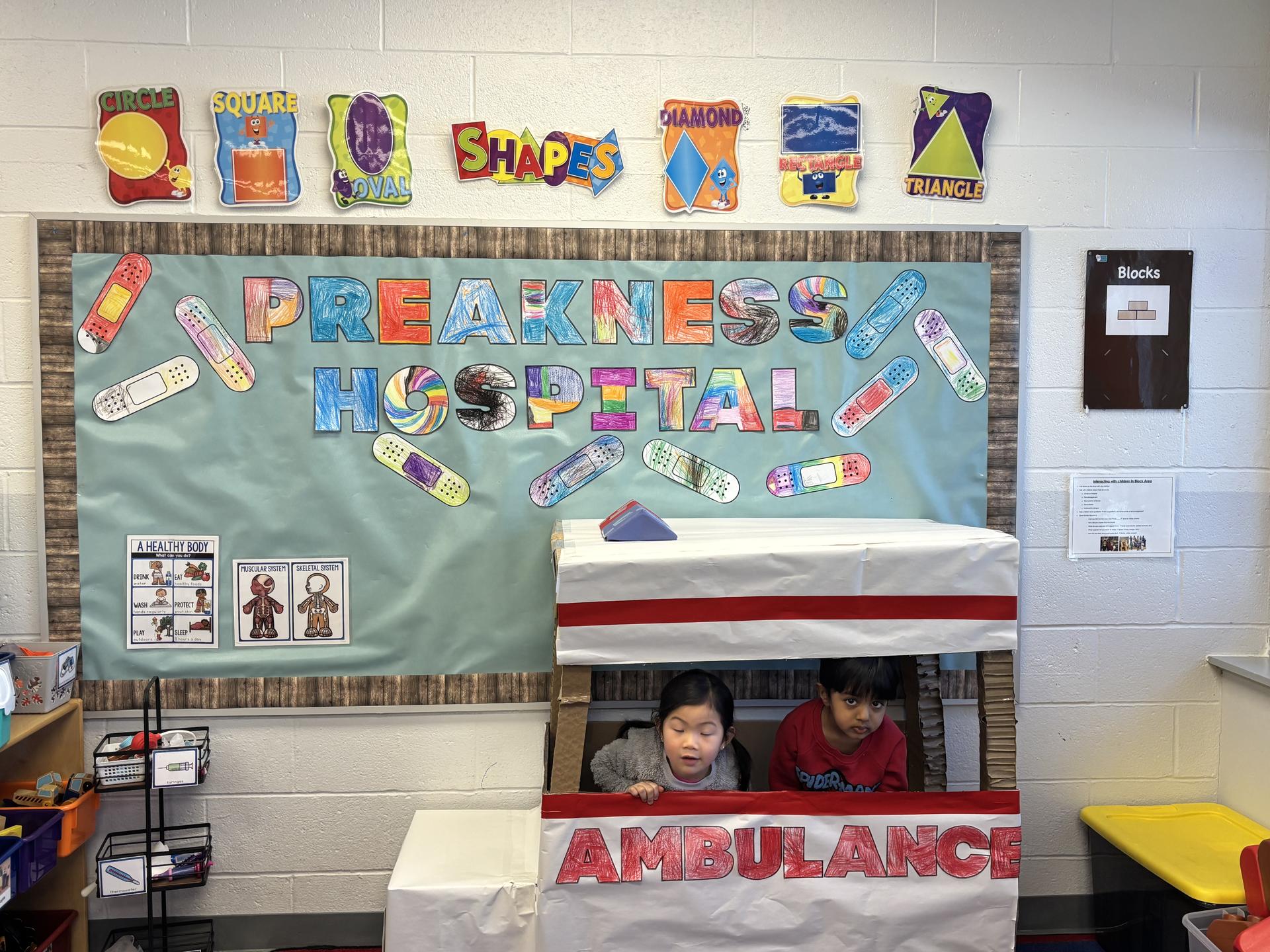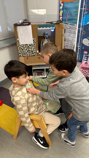 Over the past couple of weeks, our preschool classrooms at Preakness Early Childhood Center have been transforming into medical centers for their make believe play theme. Children are taking on the roles of parents, doctors, nurses, patients, eye doctors and more! Our preschoolers have been making props - ambulances, cards, flowers, and x-rays to support their play. Some centers include an emergency room, baby nursery, eye doctor, dentist and more! They are building their vocabulary and cooperative, imaginative play skills. Our school Nurse, Nurse Brie will be providing lessons on handwashing, skeletal/bones, hearing/vision and making good choices through the month of February to reinforce these concepts!