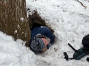 Meanwhile, students on the interpretive hike grabbed some hiking poles to navigate the uneven, snowy terrain. They learned to identify animal footprints and observed some of the effects seasonal weather conditions have on trees. They even found an empty bear cave to explore and crawl into!