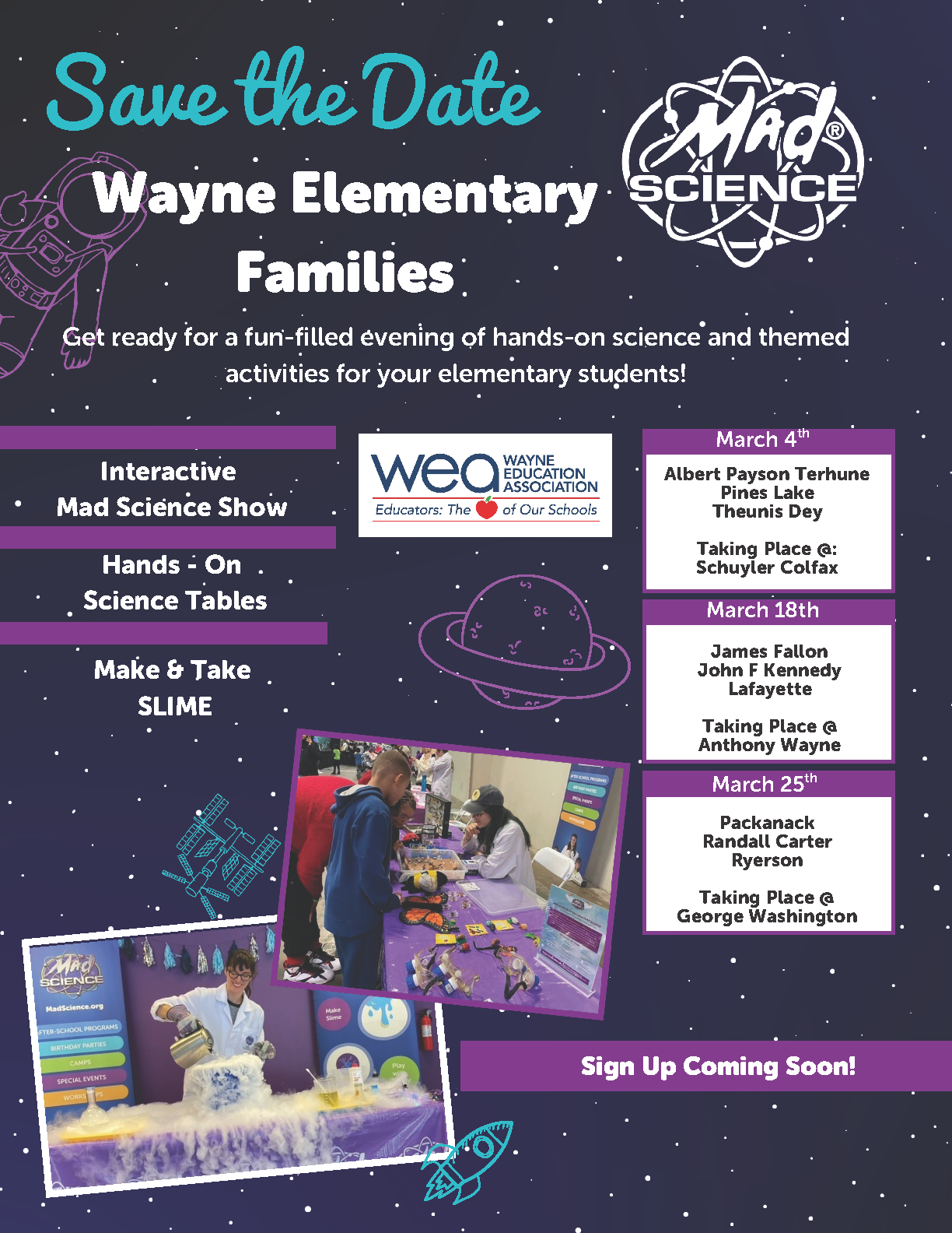 The Wayne Education Association F.A.S.T. Program (Families And Schools Together) is thrilled to partner with Mad Science for three incredible nights of discovery, experiments, and family fun! We’re inviting all nine elementary schools to join us at their future middle school homes for this special event. Check the schedule below to find out when your school is scheduled to dive into the lab!