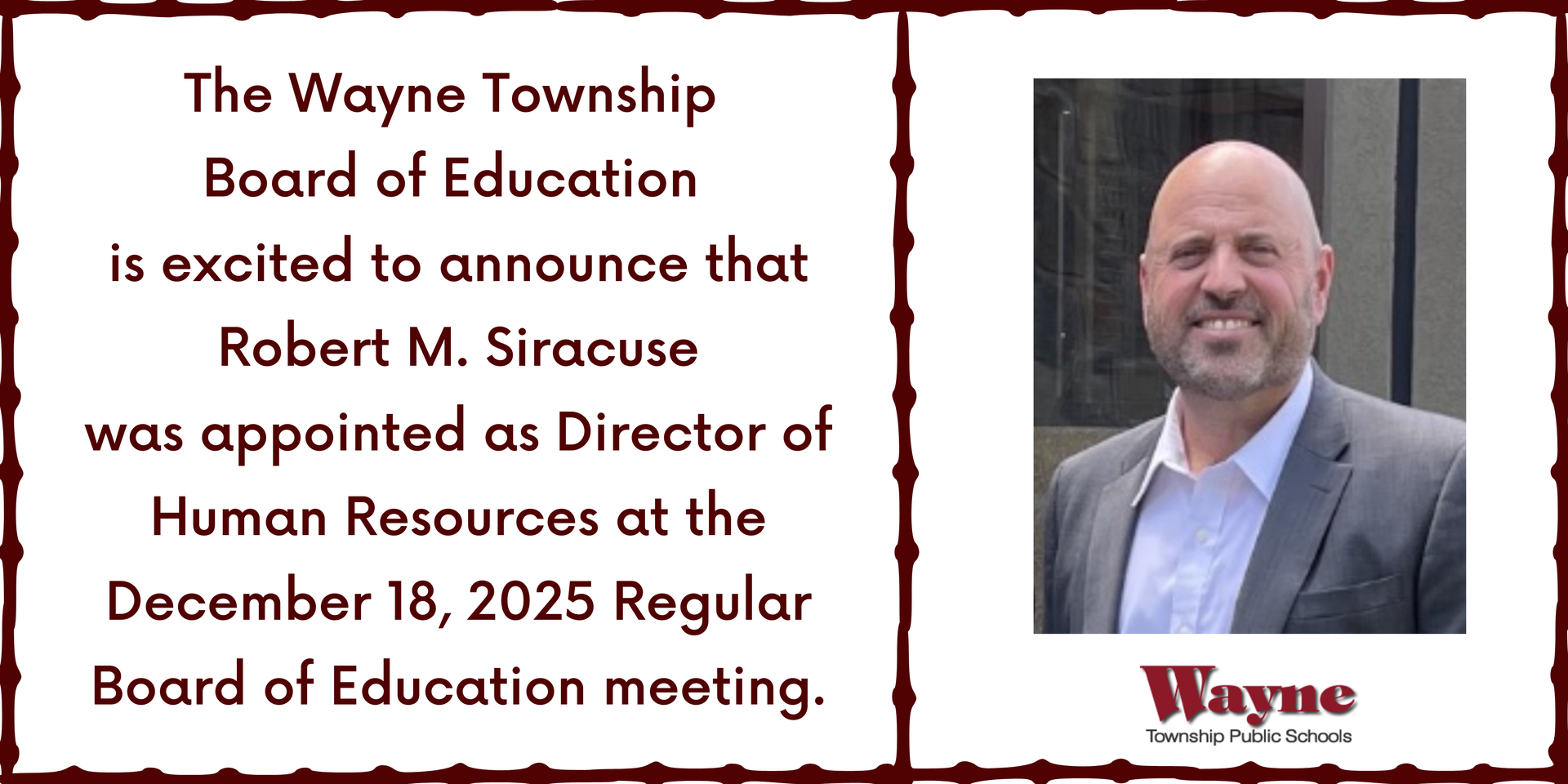 Wayne Township Public Schools is excited to announce that Mr. Robert Siracuse was appointed as Director of Human Resources at the December 18, 2025 Regular Board of Education meeting. Click here for the full press release. |